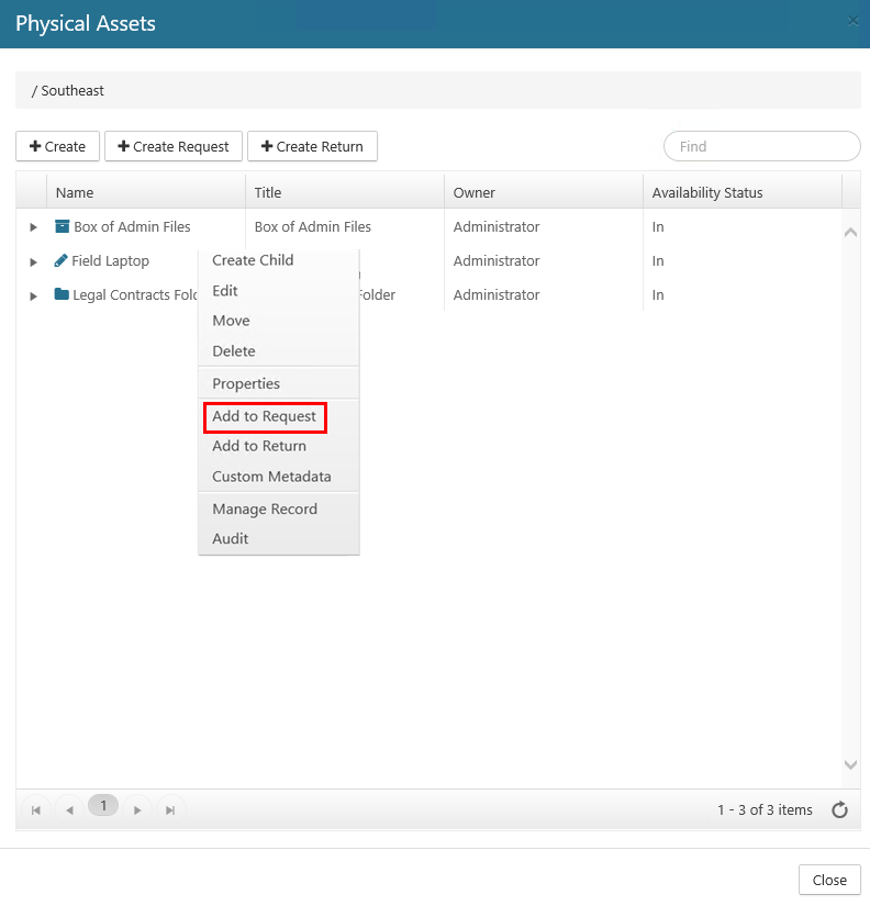On the Physical Assets dialog, right-click the asset you want to add to your request and select Add to Request. (The drop-down options you see may vary, depending on your permissions.)