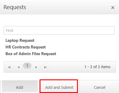 Select the request you want to add the asset to, and then click Add and Submit. This step performs two actions: it adds your request to the My Requests page and it submits the request to be processed. Two green confirmation messages display in the upper right corner of your screen.