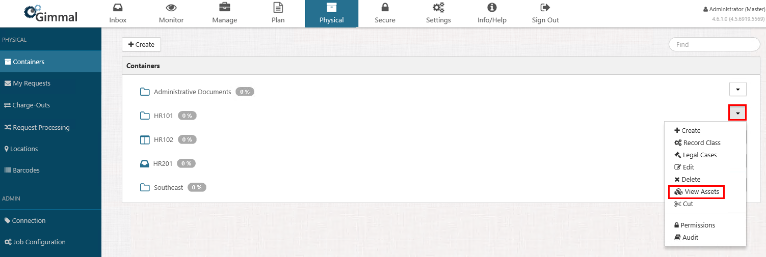 Select Physical on the Main Menu, and then Containers on the left navigation menu. The Containers page displays.