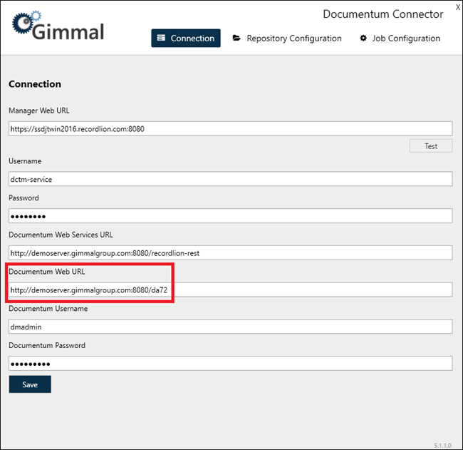 It is highly recommended to not adjust any of the Documentum information in the Connection tab after saving. Changing this setting can result in duplicate records being added.