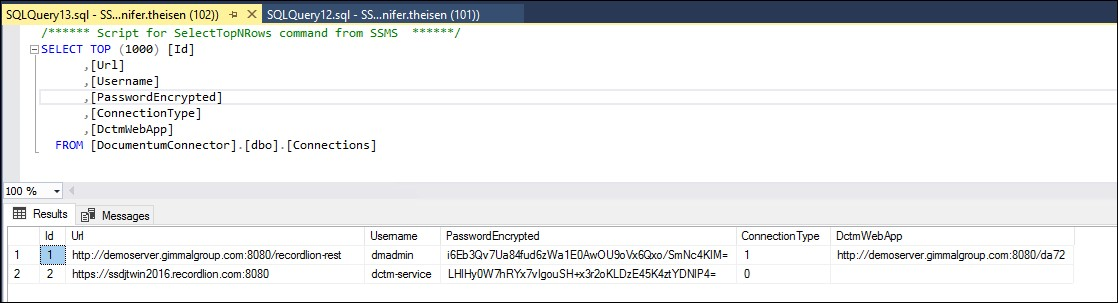 5. Open SQL Server Management Studio and make sure that the Documentum Web Url was entered in the database with an absolute path by querying the Connections table as follows; you should see the DctmWebApp column populated correctly:
