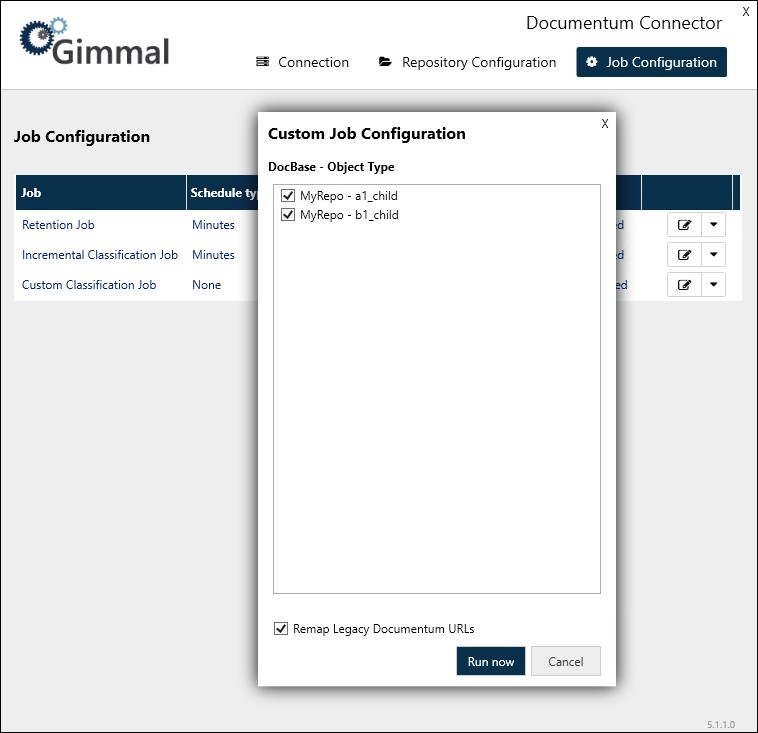 10. Select all the docbases and object types you wish to undergo the initial step of re-recordizing all the records to update to the new clickable URI format, select the "Remap Legacy Documentum URLs" checkbox, and press 'Run now'.