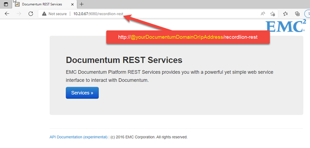 - Confirm recordlion-rest have been successfully deployed by opening a web browser to the URL http://@yourDocumentumDomainOrIpAddress/recordlion-rest-, and confirm that the web page below renders