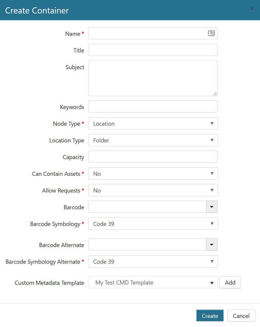 A container is a logical or location-based structure used for organizing and managing physical assets. For example, a location-based container could be a shelf, and the boxes that are stored on the shelf (which represent the physical assets). For logical-based, the container can be anything, a charge-code, a taxonomy value, etc. and the assets contained therein are those that are being managed (boxes/folders/microfiche) etc. You can create parent (root) containers and a child container, depending on your permissions. The following sections describe how to create each type of container.