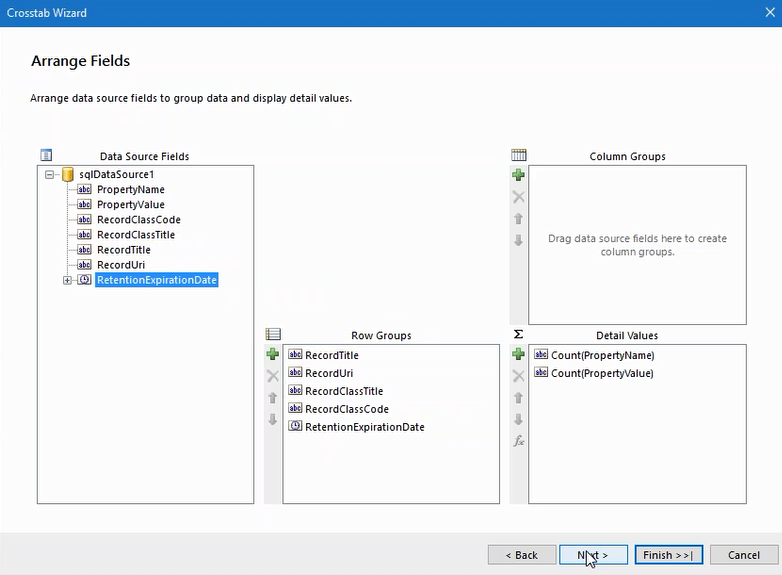 The Arrange Fields dialog box displays. This enables you to arrange the fields to group data and display detail values.
