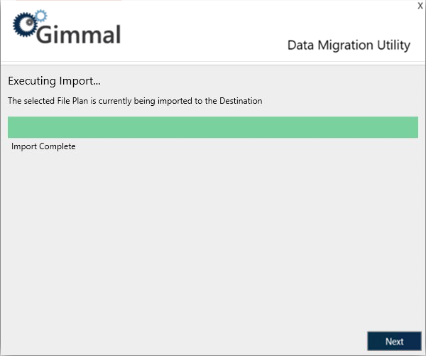 After kicking off the import, the next screen displayed is the Executing Import Screen. This screen displays the progress of the import while it is executing. Once the import has finished executing, click Next.