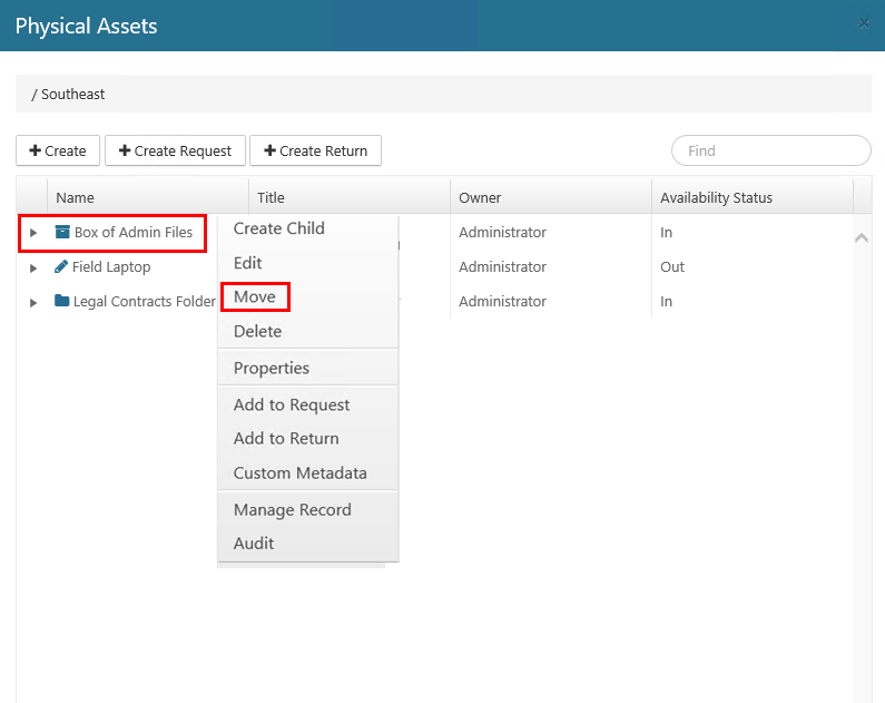 Right-click on the physical asset you want to move, and select Move.