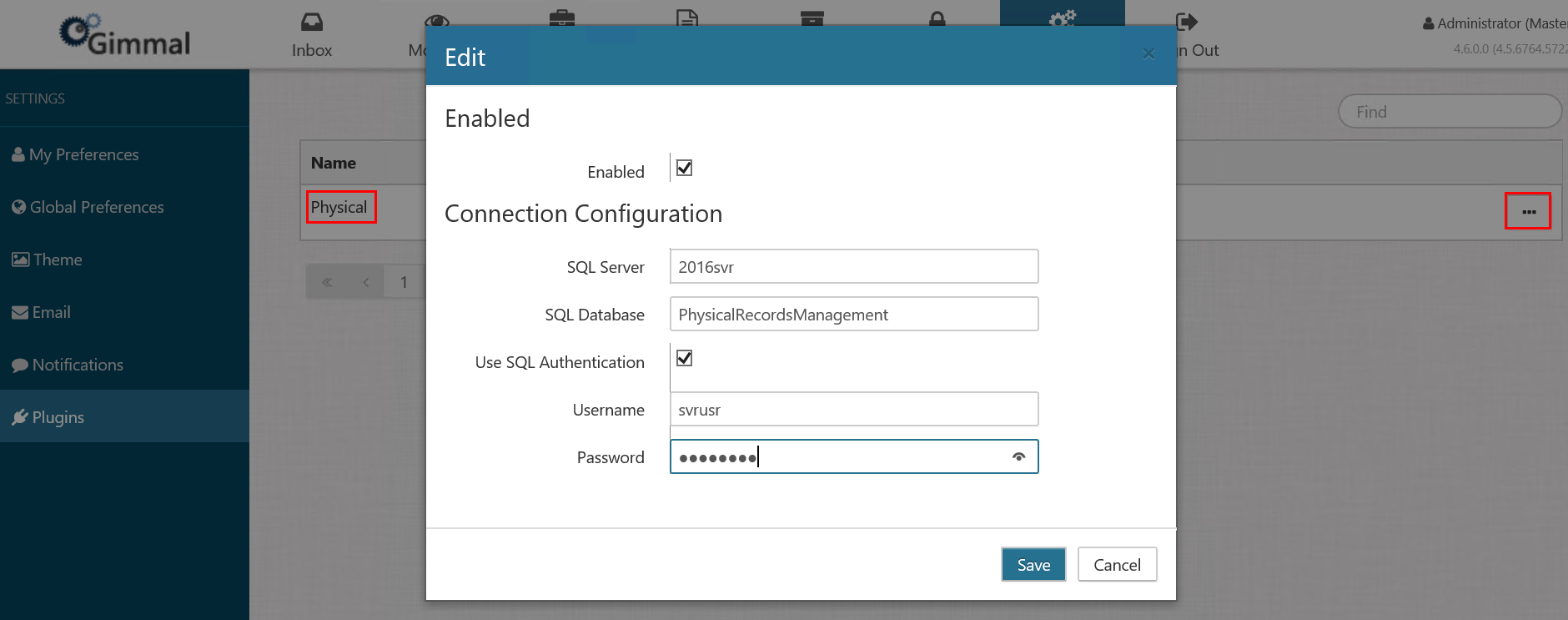 To set up Physical Records Management properly, you must configure the plugin first (using either SQL Authentication or Windows Authentication). This establishes your connection to the SQL database. Then, you can configure the Physical Records Management connection. Each authentication method is described below.