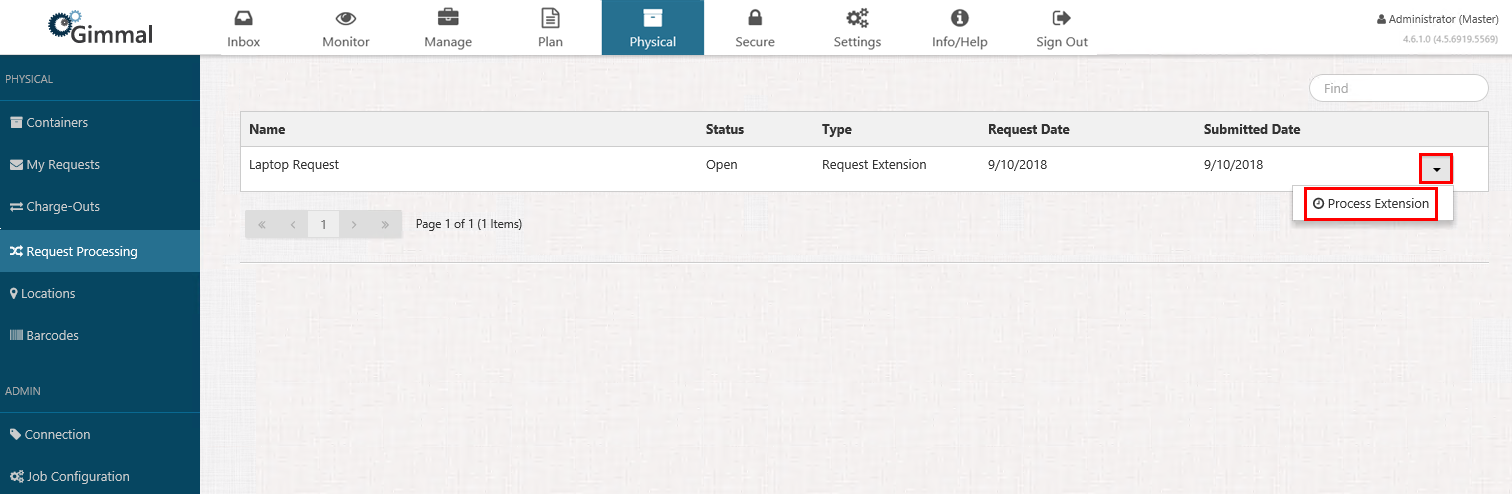 Select Physical from the Main Menu, and then select Request Processing from the left navigation menu. The Request Processing page open, along with a list of submitted extension requests. Note that the Status is "Open", indicating that the request is ready to be processed.