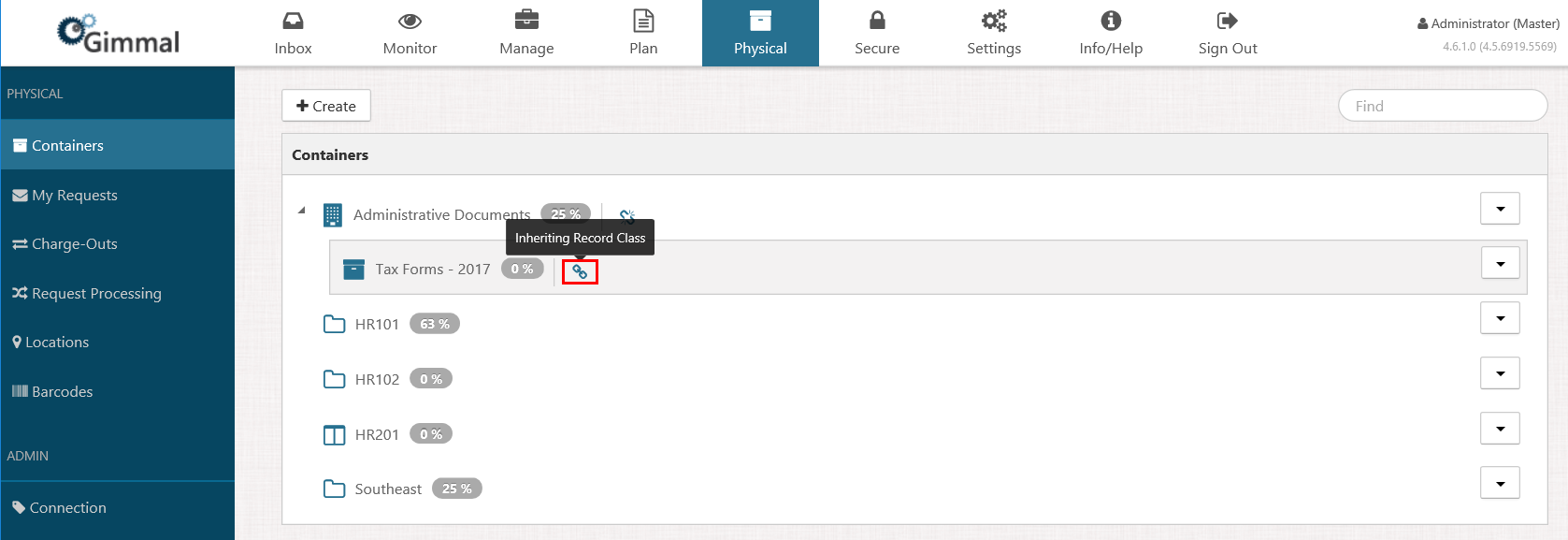 Record Class inheritance is the process by which a child container inherits the record class of its parent container. An authorized user (as described above) can break this inheritance and manually set a separate record class for a child container. If desired, you can revert the child container's record class back to the parent's record class.