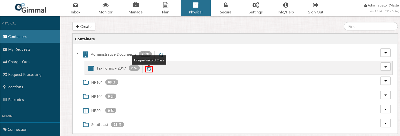 Click the Record Class drop-down, select a record class, and then click Save. The changes are saved and the new record class is assigned to the container. A "Unique Record Class" icon displays to the right of the container, indicating that a record class has been assigned to it.