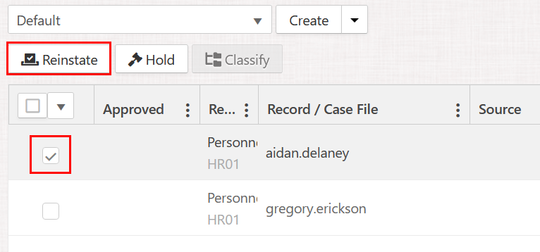 In order to submit records for disposition, they must be first reinstated. Anyone with access to the record in Rejected Records will be able to reinstate it. To reinstate, select the necessary records and click the Reinstate button.