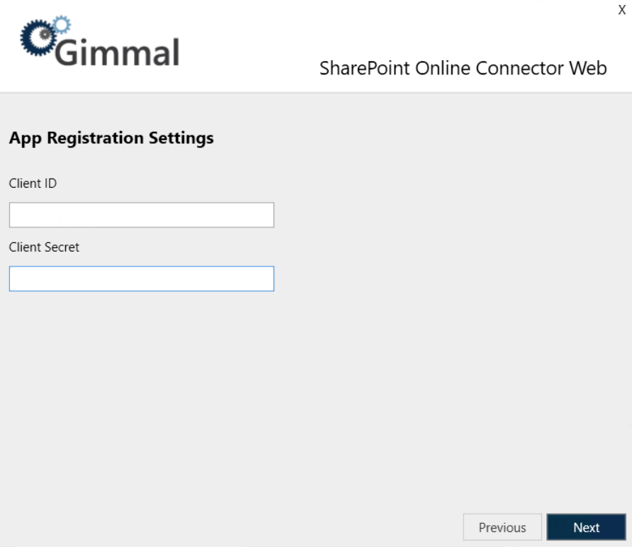 Click Next to go to the App Registration Settings screen, where you will enter the Client ID and Client Secret that were generated during App Registration.