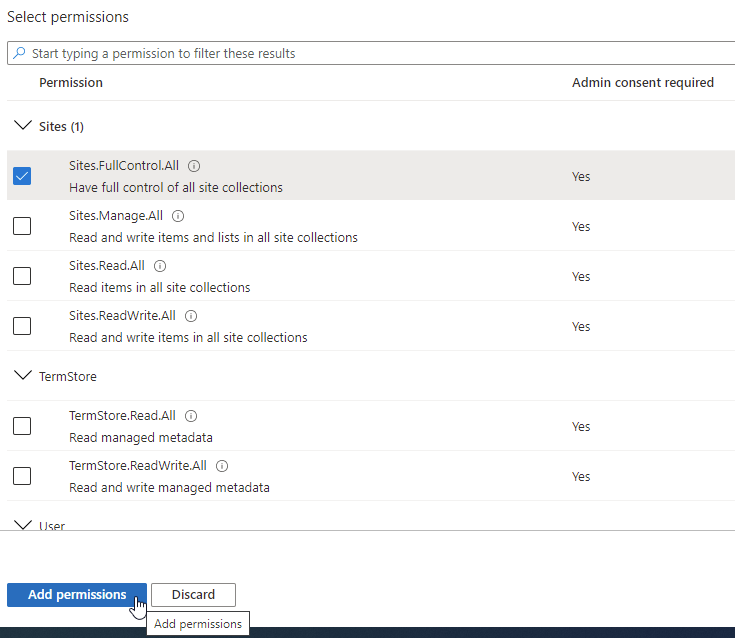 Select Sites.FullControl.All, then click Add permissions.