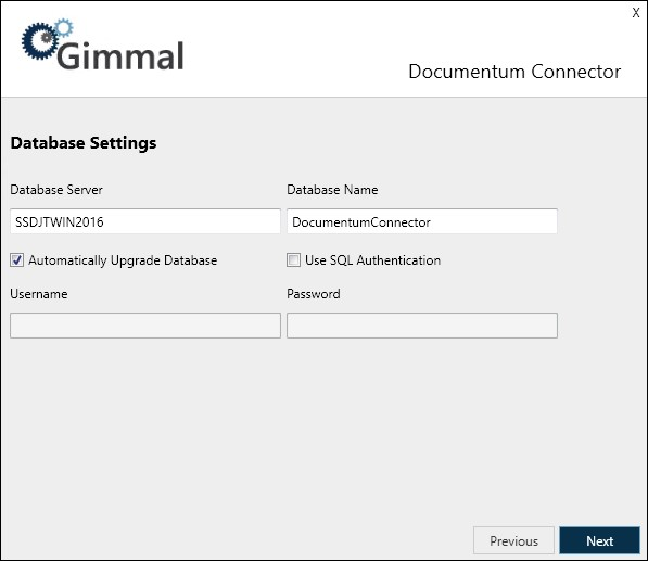 The "Database Server" and the "Database Name" settings, and the "Automatically Upgrade Database" checkbox, will be populated automatically, however, you can change these settings. For information on the settings, see the picture above.