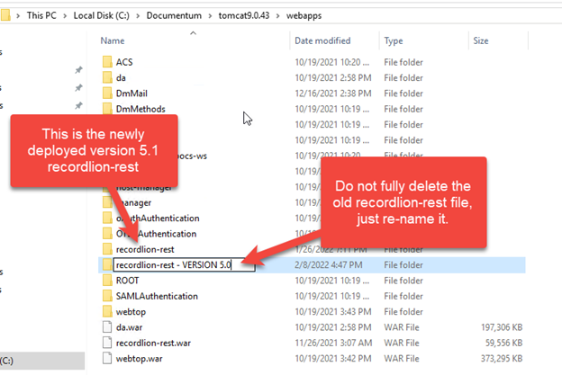As a precautionary step, do not delete the previously used recordlion-rest file when replacing it with the new recordlion-rest file, just simply rename it. (below it has been renamed to recordlion-rest VERSION 5.0).