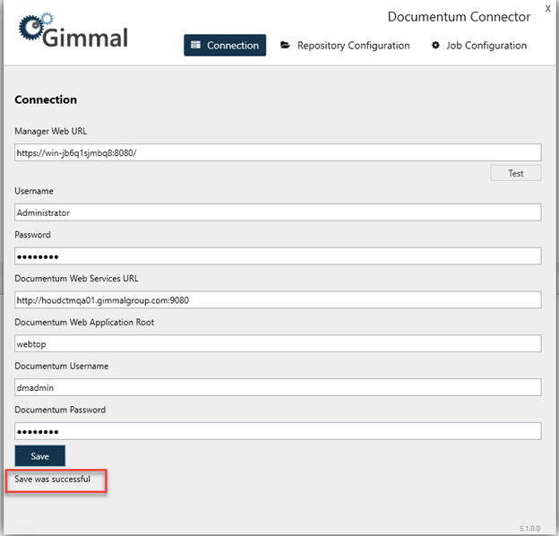 It is highly recommended to not adjust any of the Documentum information in the Connection tab after saving. Changing this setting can result in duplicate records being added.