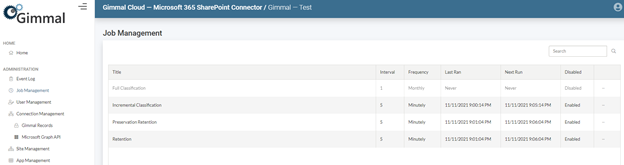 Full Classification – the Full Classification job crawls every file contained within SharePoint Online sites that were added to (5.2.5) Site Management, and notifies Gimmal Records of their existence. This job is typically executed upon initial addition of a new site. It is disabled by default, but it can be scheduled to run on a regular basis.