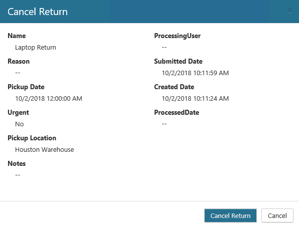If you chose to Cancel, a confirmation window will open. Click Cancel Return. On the My Requests page, the request still displays, but the Status for the return changes to Canceled.