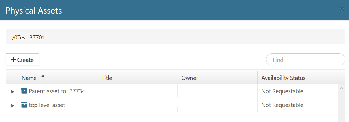 Click the Parent Select icon () to the right of the Parent field. The Containers dialog or the Assets dialog opens, providing a list of possible containers or assets that you can select and copy the asset to.