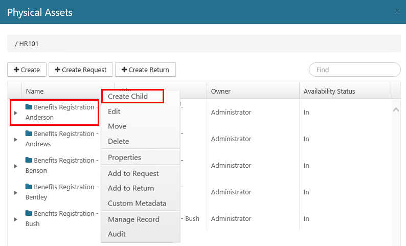 Click Create. The new child asset is added to the Physical Assets dialog, under the parent asset.