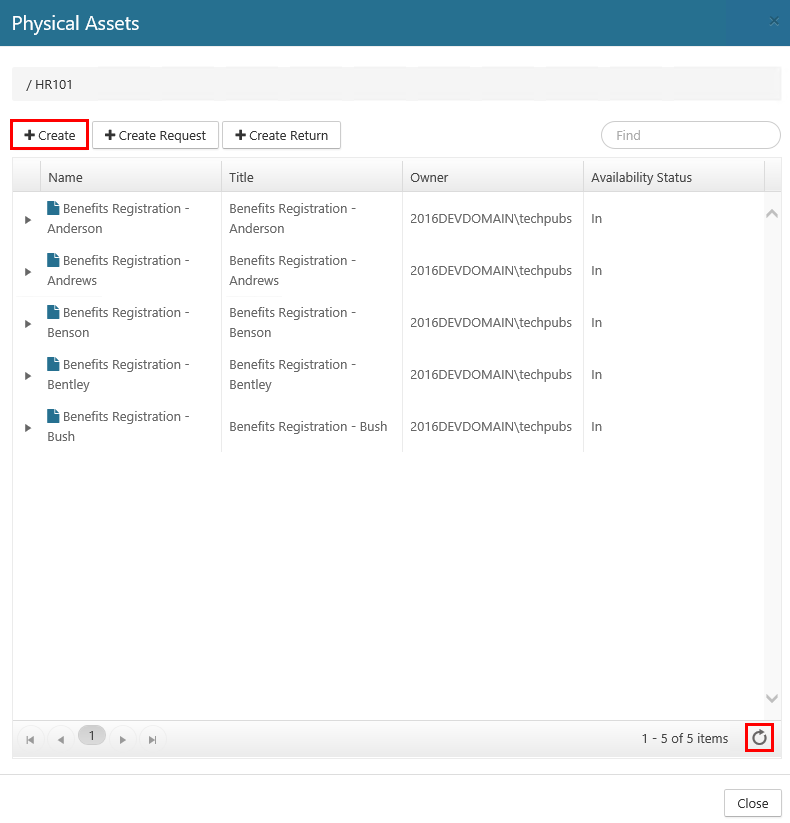 Click Create. The Create Asset dialog closes, and the Physical Assets dialog opens. The new asset displays in a list on this dialog.