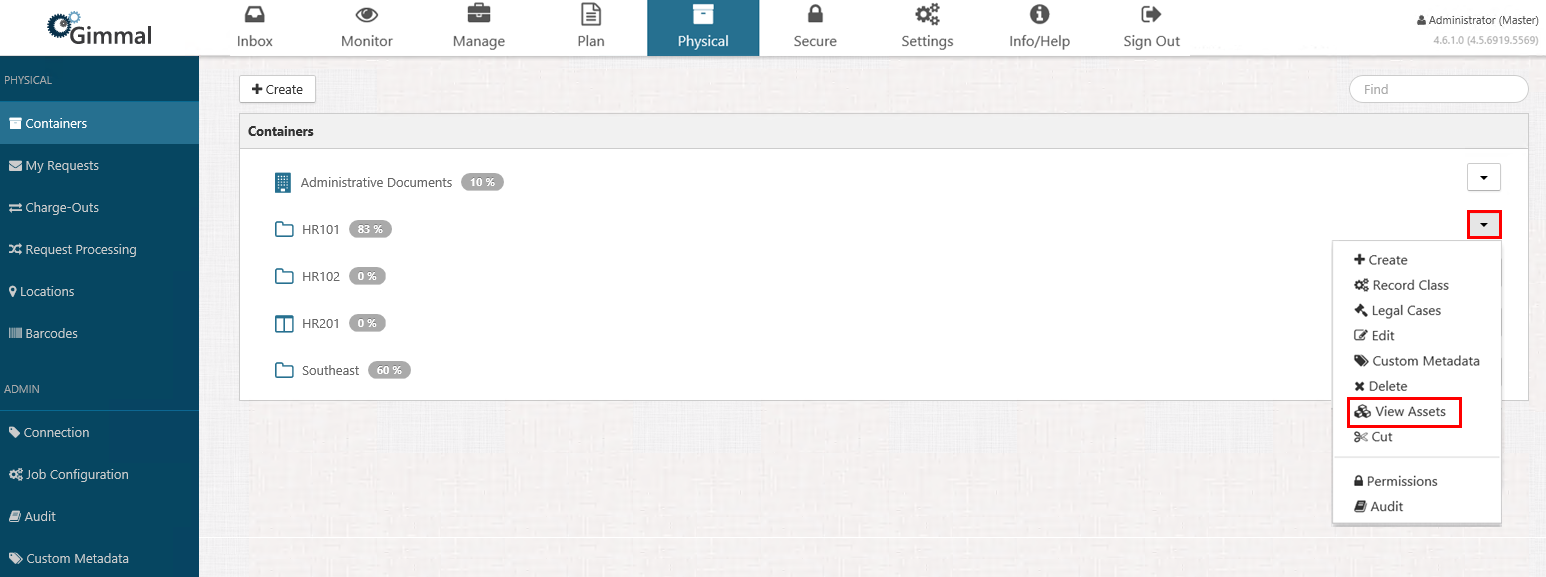 Click the drop-down for the desired container and select the View Assets option. The Physical Assets dialog opens.