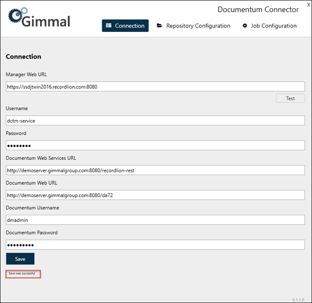 It is highly recommended to not adjust any of the Documentum information in the Connection tab after saving. Changing this setting can result in duplicate records being added.