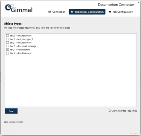 7. Click the 'Repository Configuration' -> select the docbases and object types that you made note of in the prerequisites, and click Save.