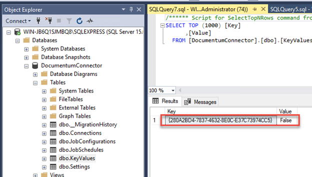 Open SQL Server Management Studio and double-check that the KeyValue entry in the Documentum Connector database has been populated.