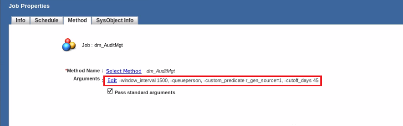 - Select Jobs > dm_AuditMgt on the Jobs screen. Next select Properties > Method tab > Edit > set the cutoff_days value to 30 or higher.