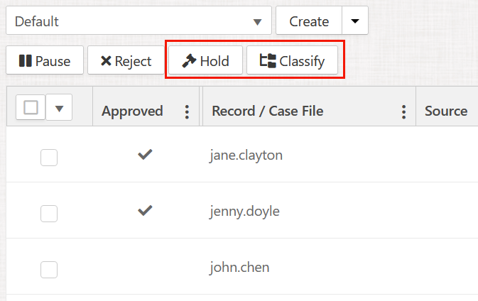 Users with the Record Manager role or higher can place items on hold or reclassify during the disposition process. These options are available in the Inbox, Expired Records, and Rejected Records.