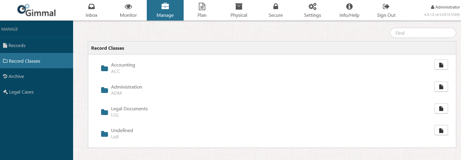 The Record Classes option in the left Navigation menu provides a list of the records being managed. The list is organized by Record Class, and the Record icon to the right of the Record Class name enables you to view all of the records associated with a Record Class.