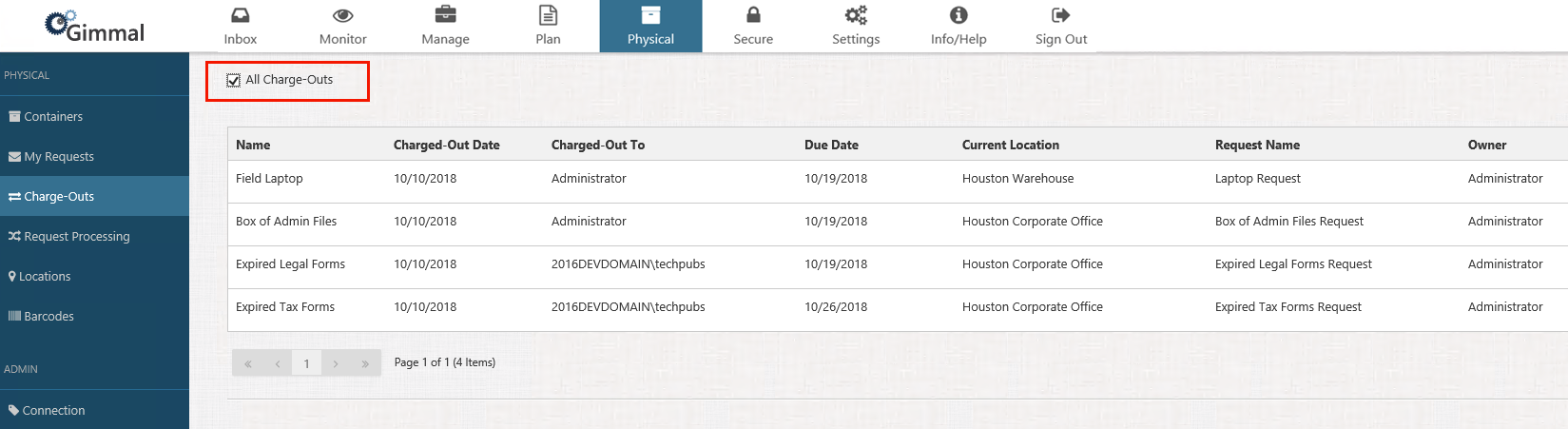 Managing charge-outs is generally covered in the (5.2.5) Managing Charge-Outs topic in the User's Guide, however, Physical Administrators have a few more options available on charge-outs: