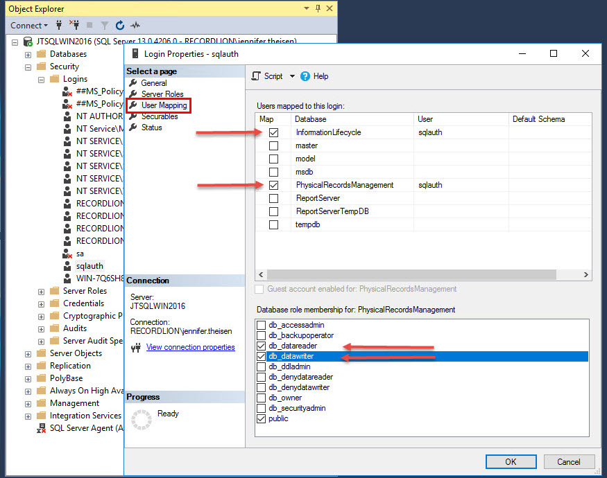 Click OK. This concludes the steps required in SQL Server Management Studio.