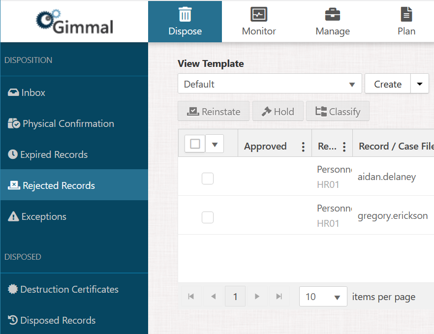 In order to submit records for disposition, they must be first reinstated. Anyone with access to the record in Rejected Records will be able to reinstate it. To reinstate, select the necessary records and click the Reinstate button.
