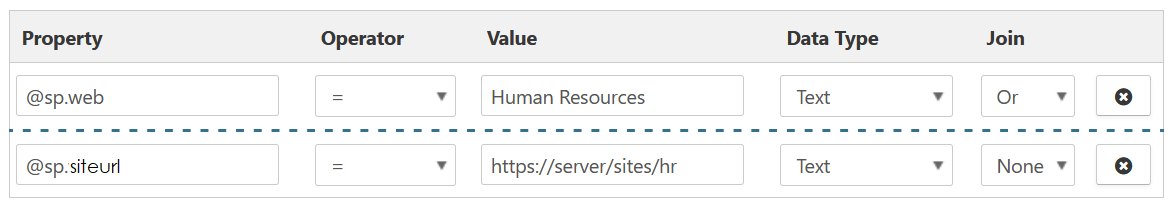 To create broad rules, use the Site or Site Collection. In the example below, @sp.web matches the Site of a document and @sp.siteurl matches the URL of the HR site.