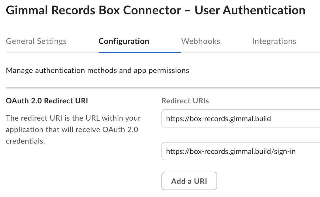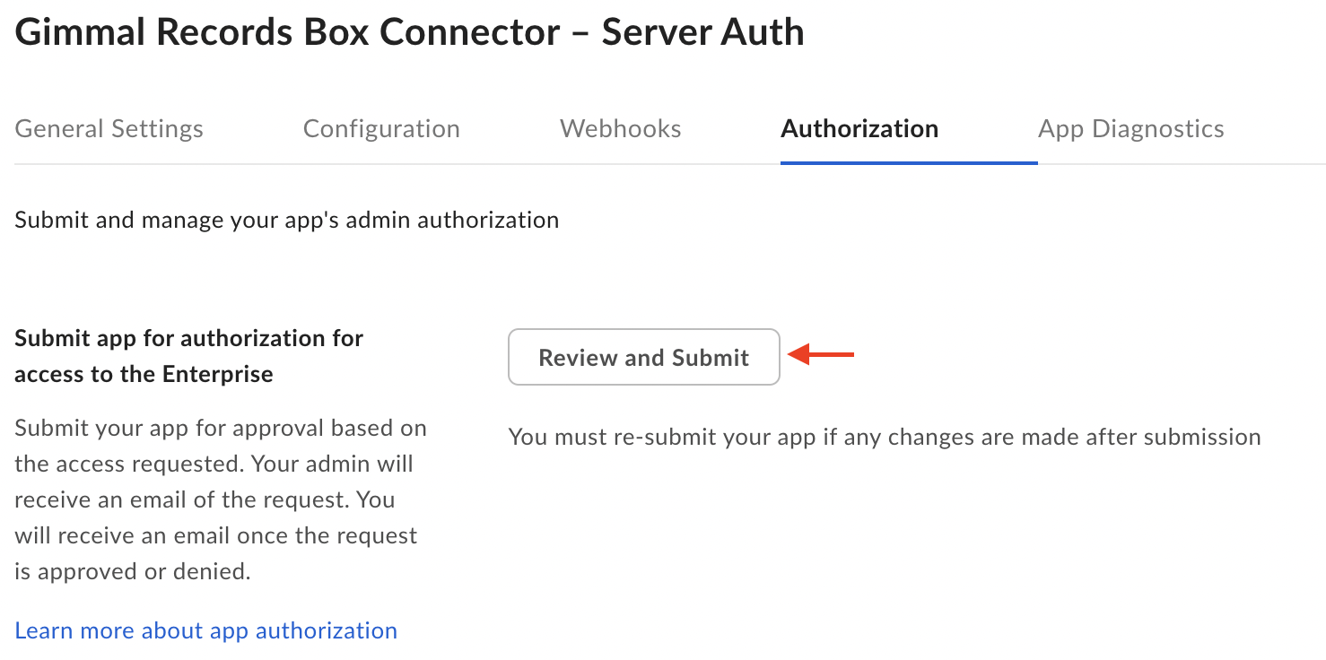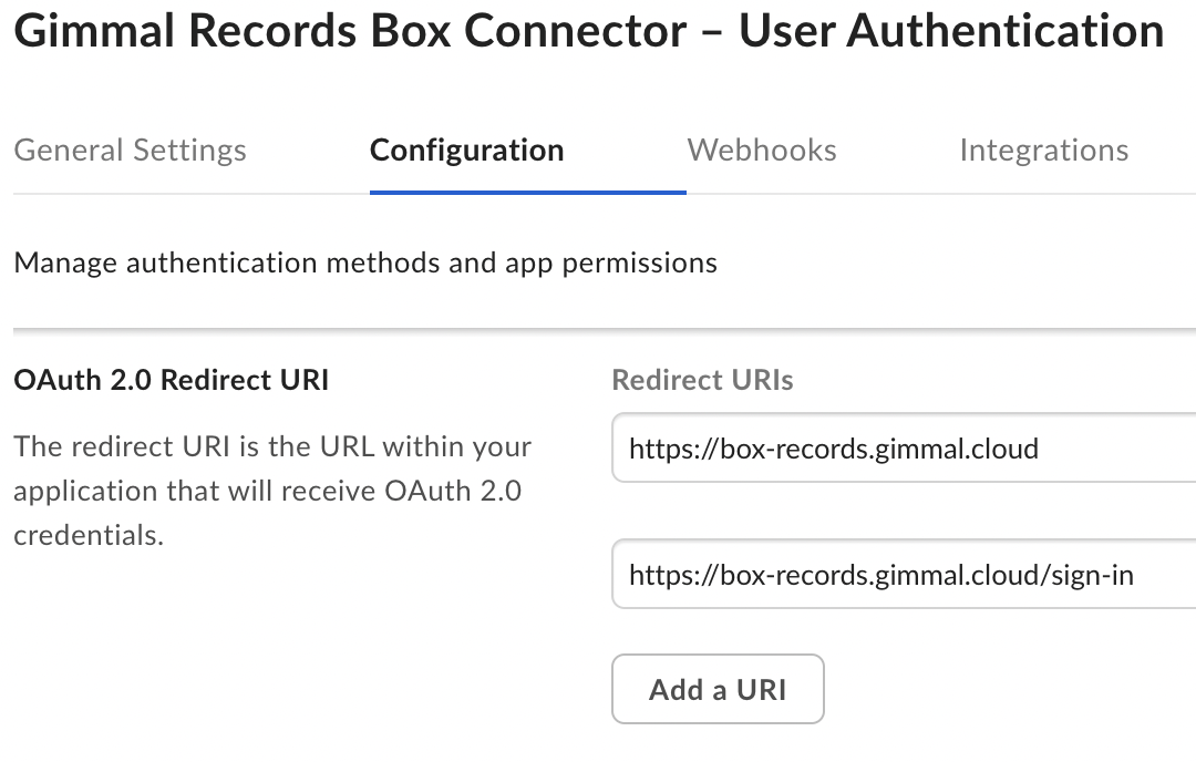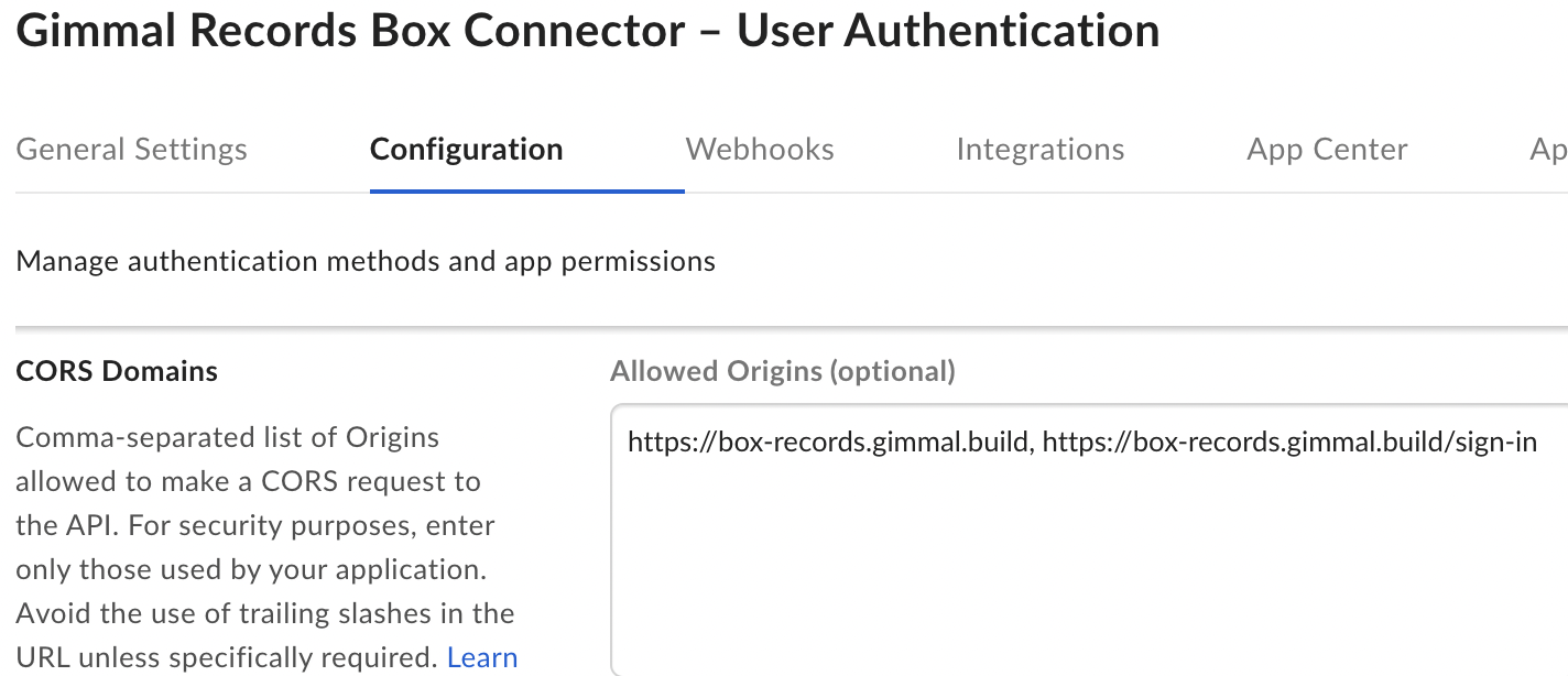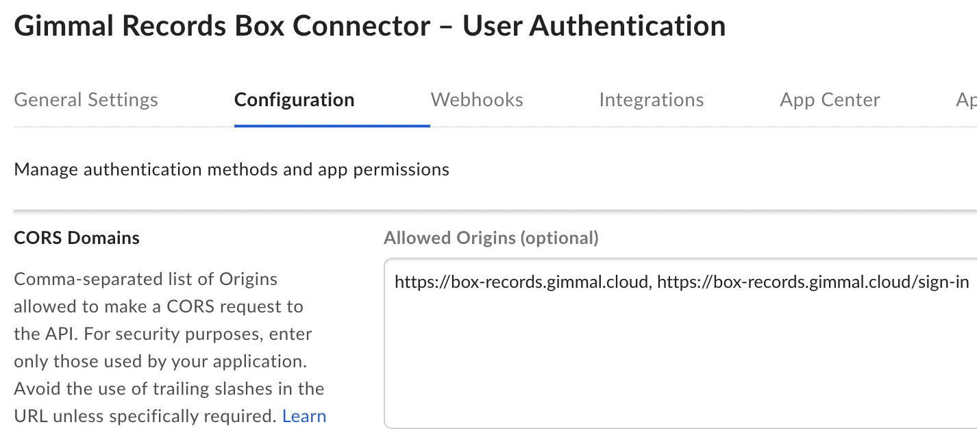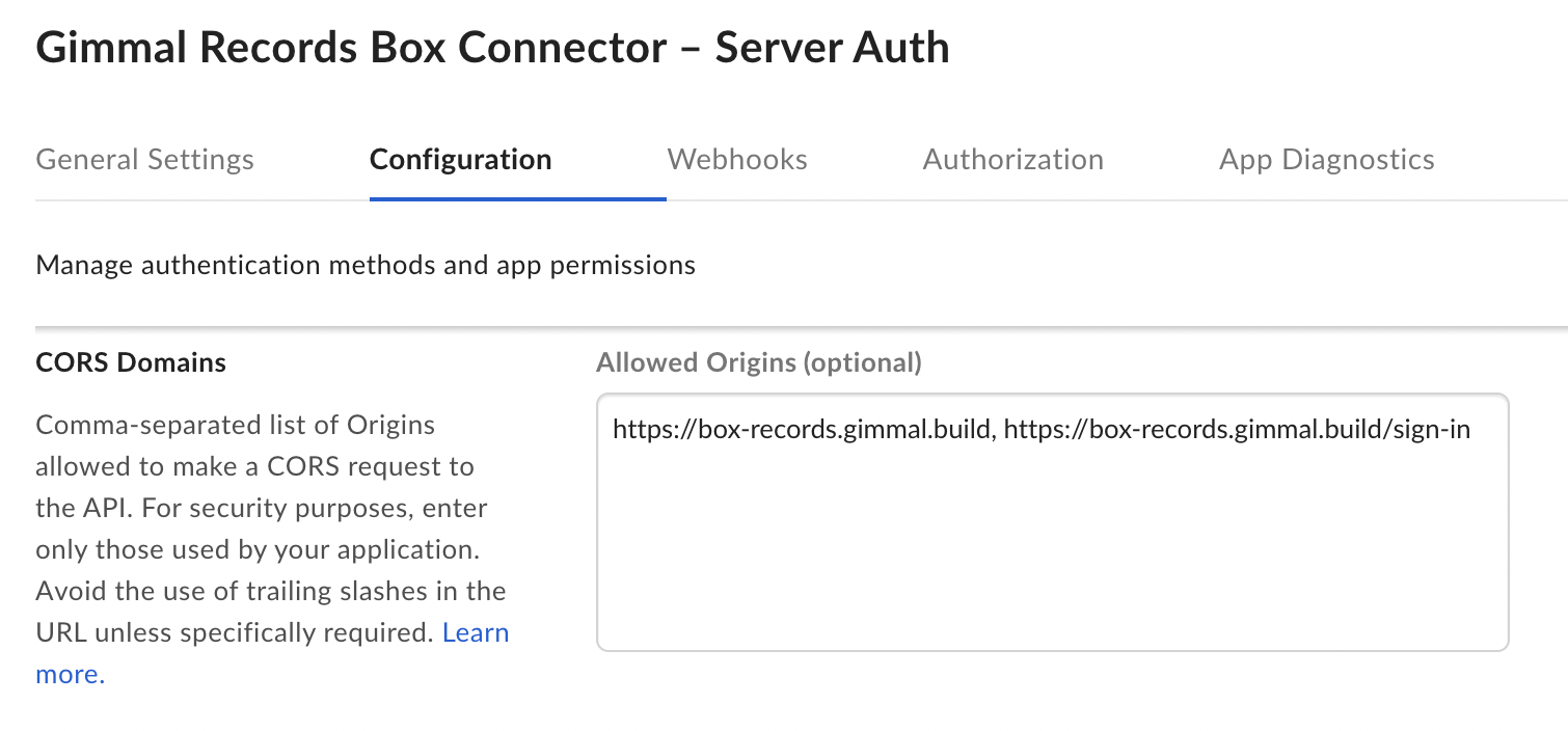 You must configure your box account to use a custom subdomain. This enables the Gimmal Box Connector to uniquely identify requests to/from your Box account back to your Gimmal Box Connector subscription. For more details, please follow Box’s instructions on their Custom Setup for your Enterprise page.