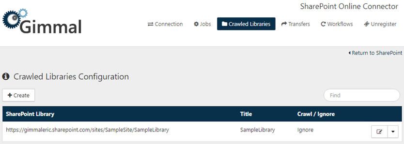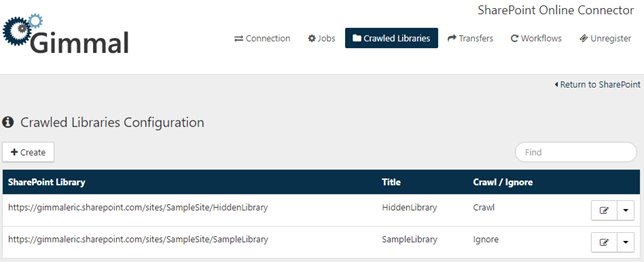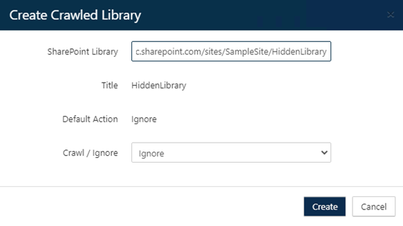 By default, the SharePoint Online Connector manages content in Document Libraries that are not hidden and are not excluded from a search. The Crawled Libraries tab allows for customized control of this behavior, allowing the creation of overrides to crawl content in hidden libraries or to ignore content in non-hidden libraries.