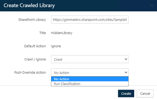 6. If an override changes a Library’s existing behavior from Crawl to Ignore or from Ignore to Crawl, a Post-Override Action field will appear. This will allow for a one-time, immediate action to be started by the Connector.
