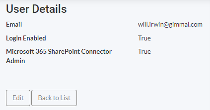The User Details will display. Click Edit to edit the user or click Back to List to return to list of users.